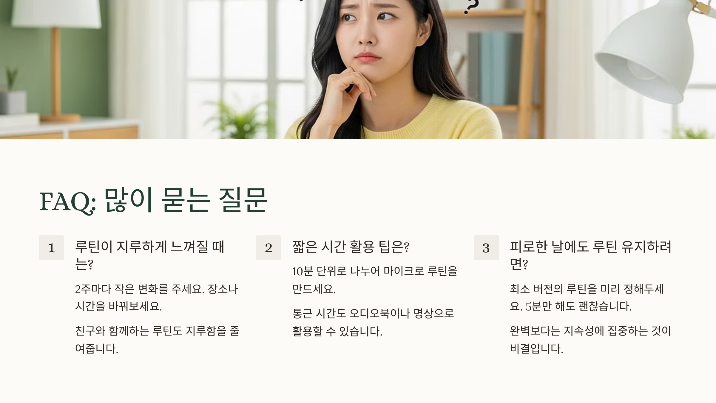 A4. 방해받지 않는 ‘내 시간대’를 먼저 확보해보세요. 이른 저녁이나 자기 전 30분만 확보해도 충분히 루틴을 실천할 수 있어요.