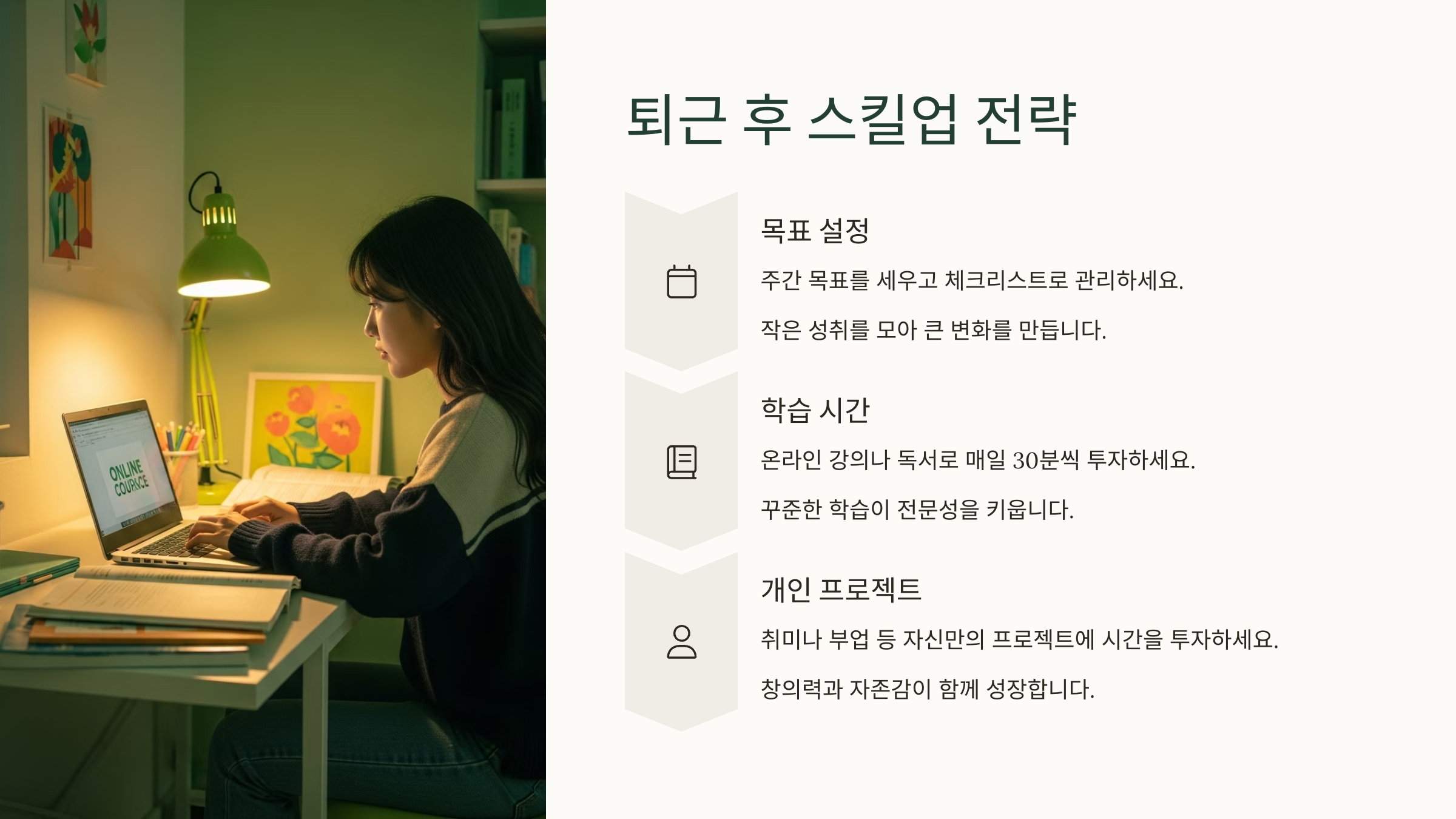 퇴근 후 시간은 단순한 휴식이 아니라 ‘성장 자산’이에요. 이 시간을 통해 나만의 경쟁력을 키울 수 있다면 하루하루가 투자 가치로 바뀌게 돼요.