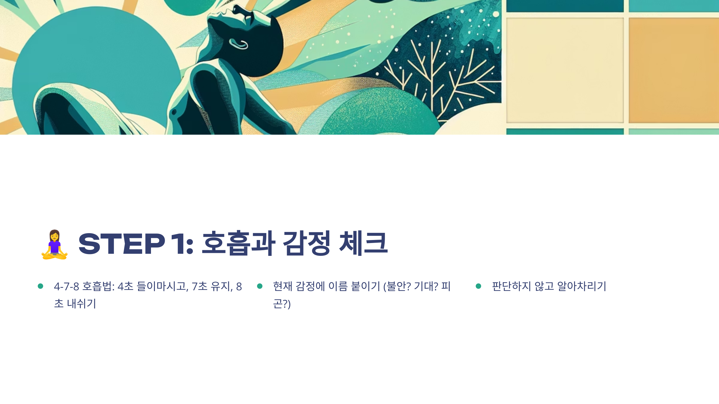 이 단계는 하루 중 언제든 다시 꺼내 쓸 수 있는 '마음 응급처치 키트' 같은 역할을 해요. 중요한 발표나 회의 전, 혹은 감정이 흔들릴 때도 짧은 호흡 루틴 하나로 자신을 다잡을 수 있답니다.