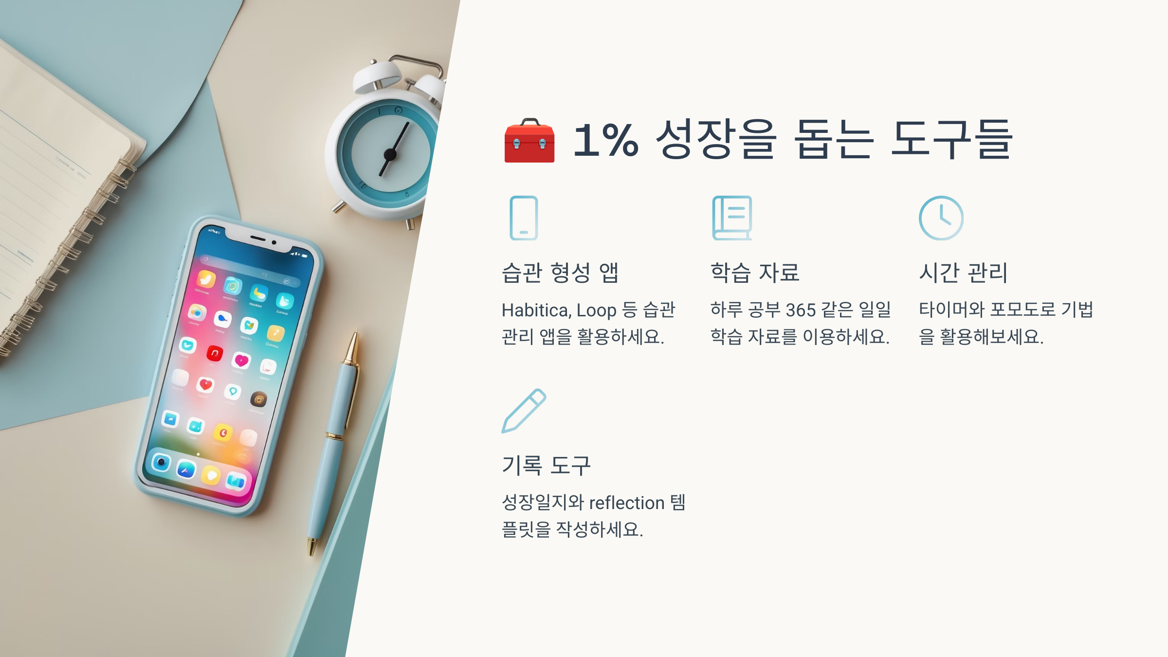 하루 1% 성장을 실천하려면, 똑똑한 도구의 힘을 빌리는 것도 아주 중요해요. 스마트폰 하나만 잘 활용해도 습관 형성이 훨씬 쉬워지거든요.