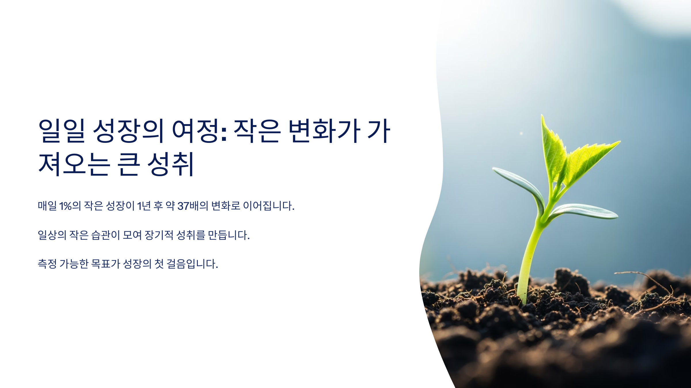 1일 1성장은 하루에 하나씩 자신을 성장시키는 실천을 뜻해요. 이 개념은 ‘조금씩이라도 앞으로 나아가는 힘’에서 출발했죠. 갑자기 큰 변화를 추구하기보다, 작고 반복 가능한 행동을 통해 꾸준함을 기르려는 접근이에요.
