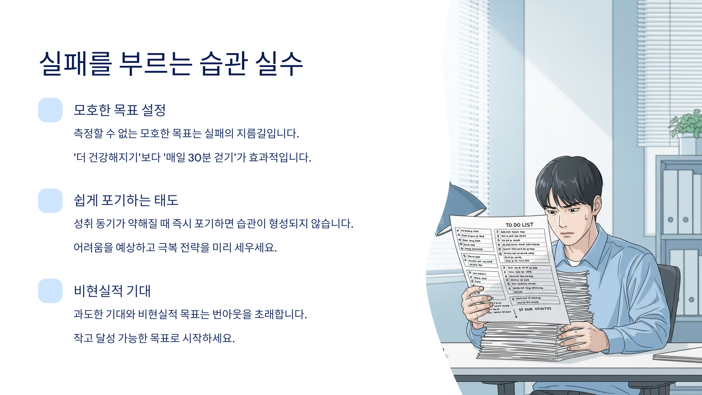 첫 번째 실수는 ‘욕심내기’예요. 처음부터 너무 많은 걸 시도하면 부담이 커져요. ‘하루 1시간 운동’ 같은 과도한 목표는 오히려 실패를 유도해요. 작게 시작해서 성공의 경험을 자주 느끼는 게 중요해요.