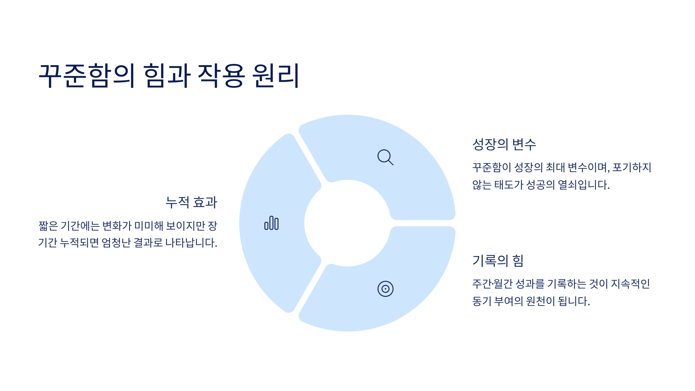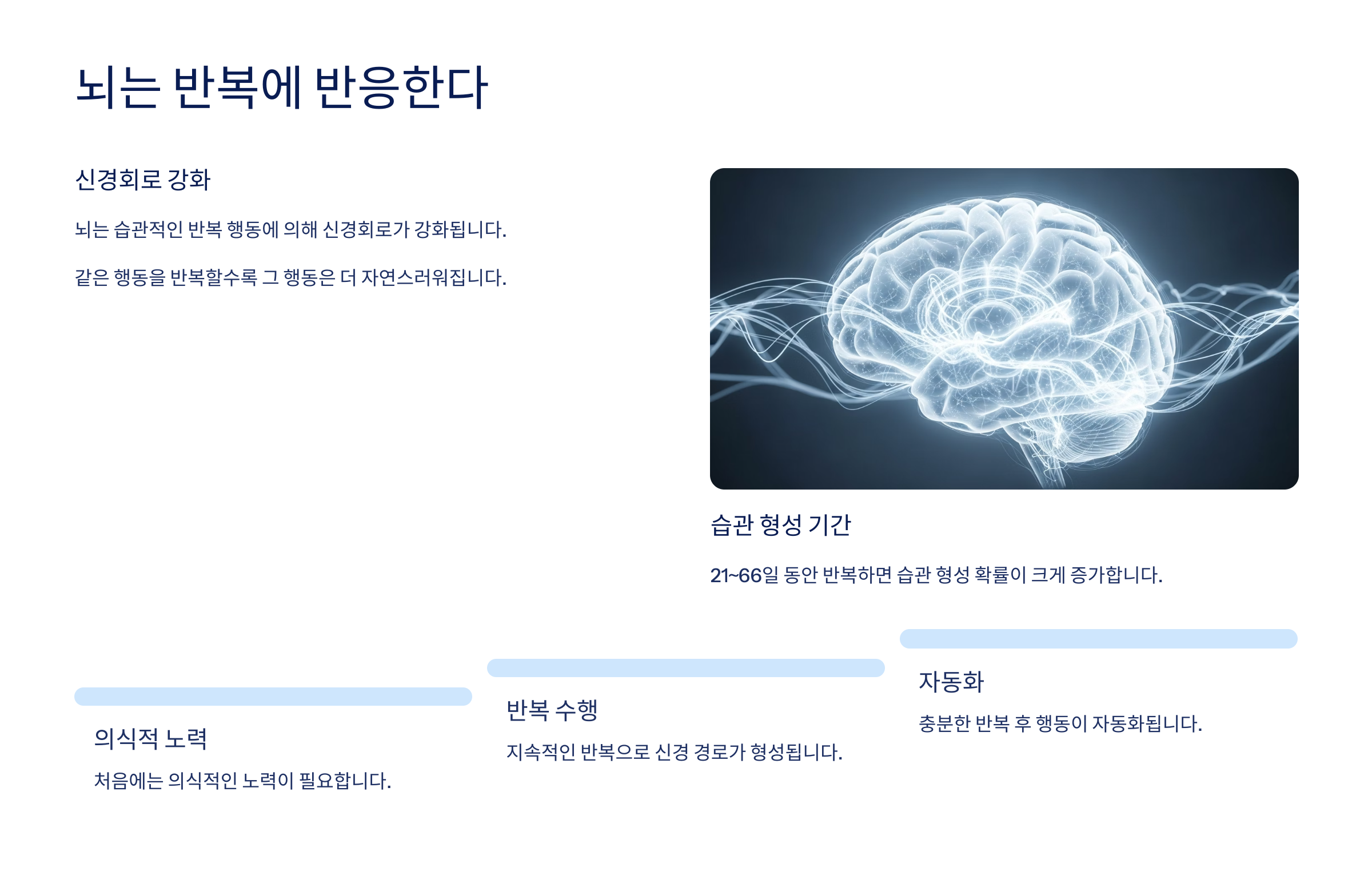 꾸준함은 생각보다 훨씬 더 강력한 힘을 발휘해요. 우리 뇌는 반복되는 자극에 익숙해지고, 결국 자동적으로 행동하게 되는 특징이 있거든요. 이 과정을 '신경 가소성'이라고 해요. 새로운 행동이 반복되면 뇌가 해당 경로를 강화해서 습관으로 정착시켜요.