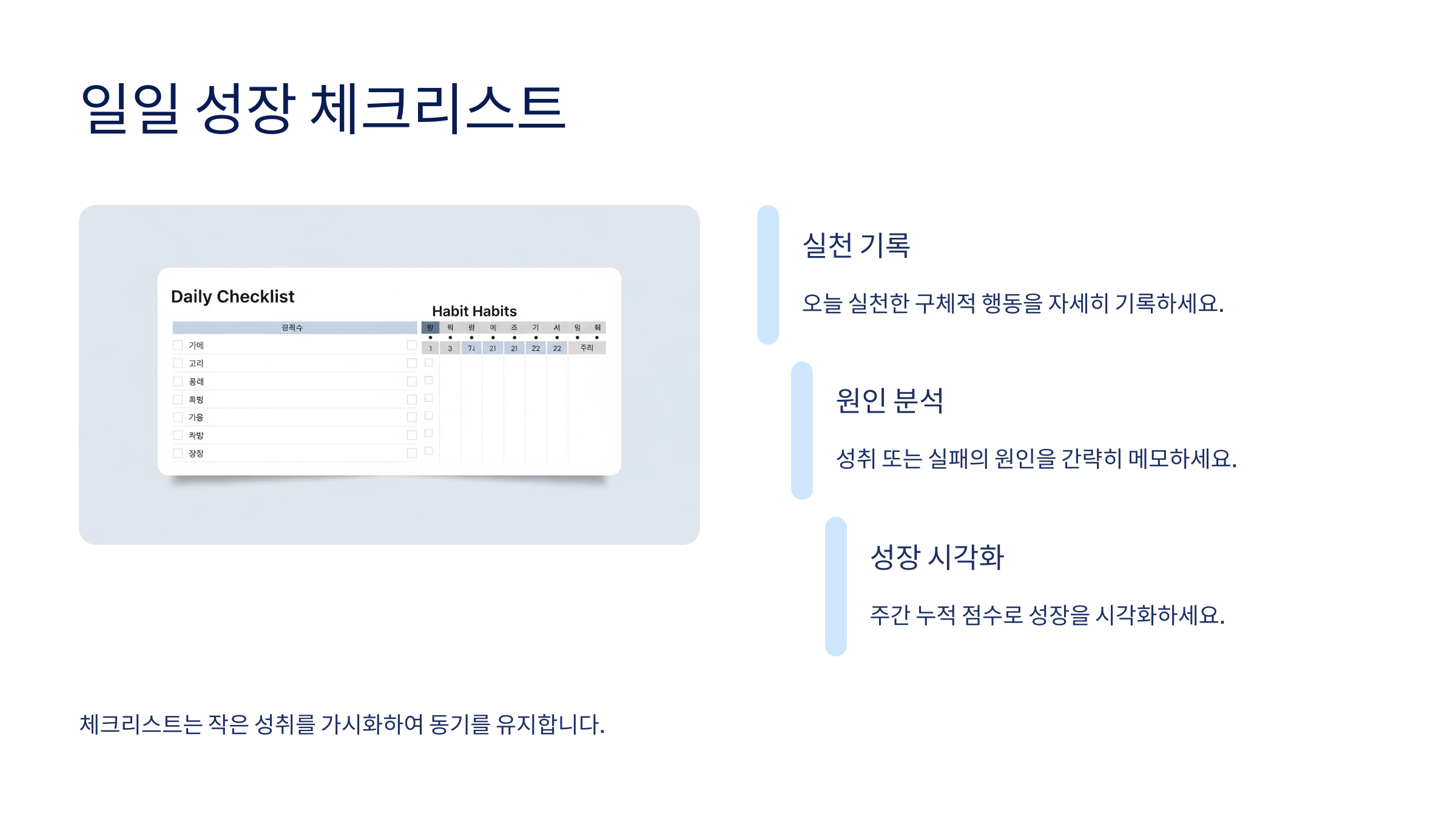 1일 1성장을 꾸준히 이어가기 위해선 눈에 보이는 도구가 필요해요. 바로 ‘성장 체크리스트’예요. 하루하루 내가 어떤 실천을 했는지 스스로 확인하고 점검할 수 있는 체크리스트는 아주 강력한 습관 유지 도구랍니다. 😊